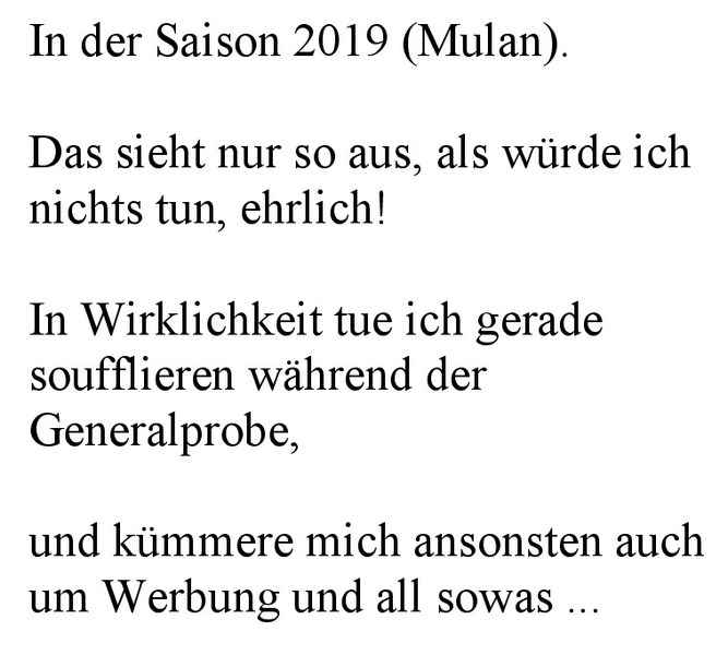 Nun, im zarten Alter von 75 Jahren und nach 24 aktiven Jahren im Theaterverein habe ich mich schweren herzens entschlossen, mich nicht mehr für aktive Aufgaben oder in den Vorstand wählen zu lassen. Dafür haben wir im Verein genügend Nachwuchs mit vielen Ideen und mit viel Energie. Die neuen Techniken sind eher Sache der Jugend.
